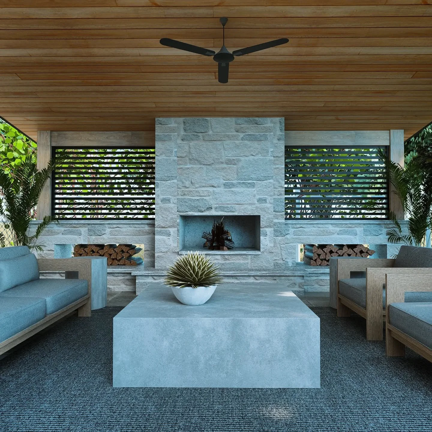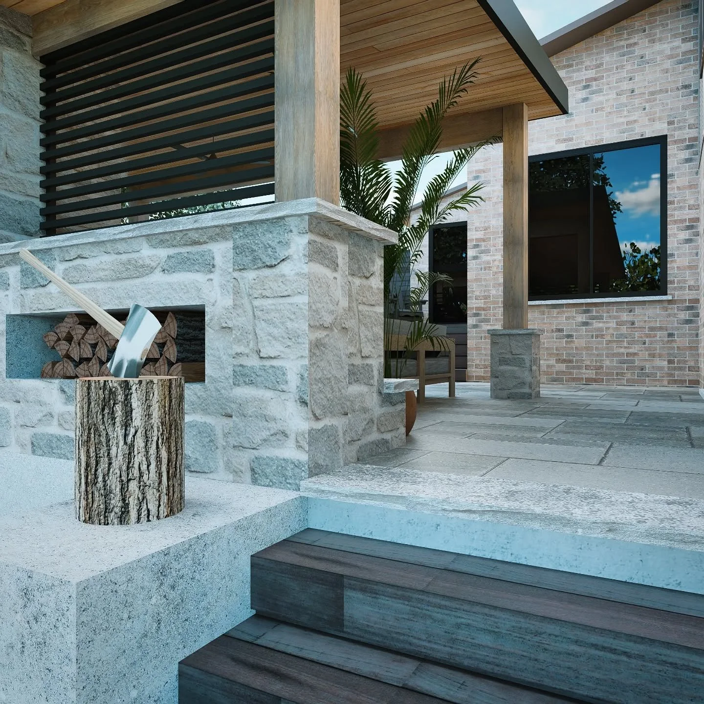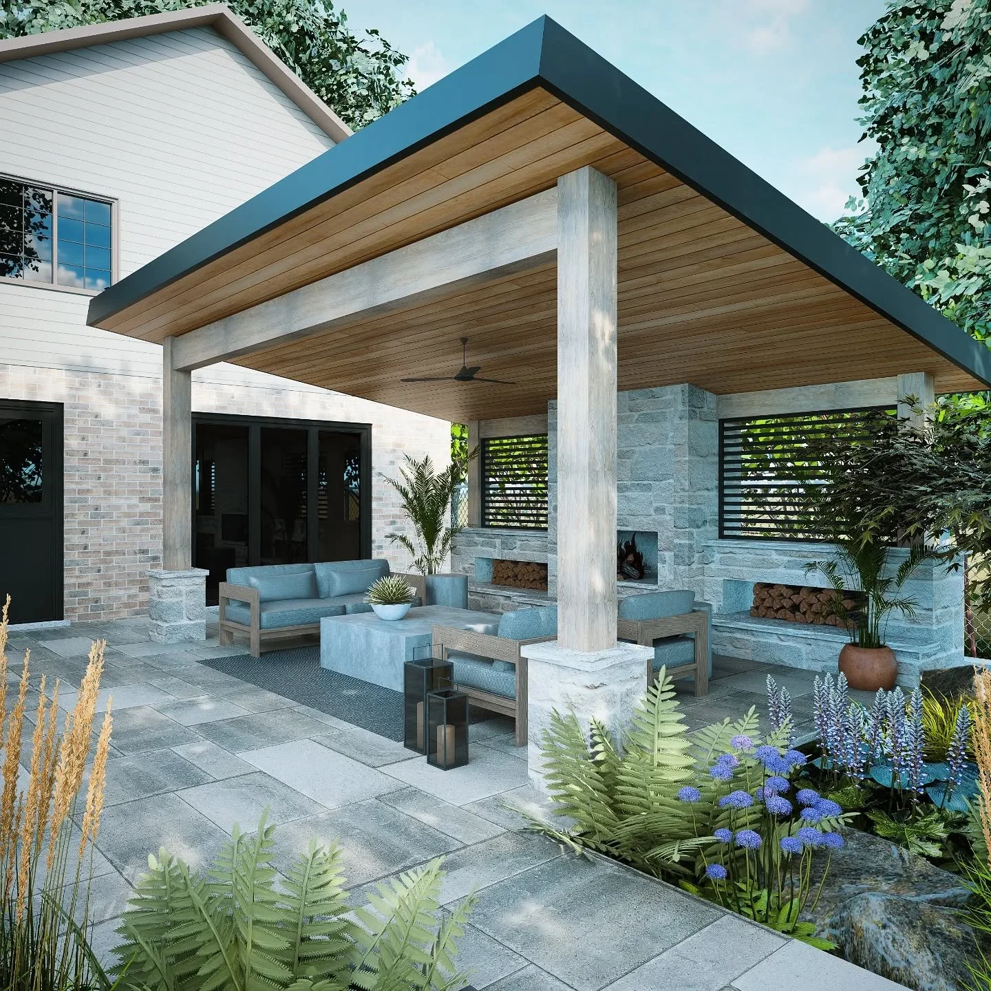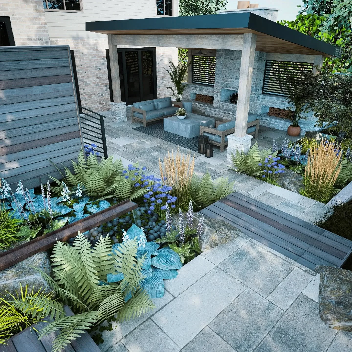 Located in Warbler Woods, a mature neighbourhood in south west London Ontario. The brief for this project was difficult as there was competing styles between each client and a steep 7’ grade change that needed serious attention. We managed to blend the competing styles and create a west coast aesthetic and compliment the woodland like neighbourhood with the large oversized timbers. We took advantage of the grade change to create a one-of-a-kind entry that also features a steel rill water feature surrounded by low maintenance plantings. This leads into the covered lounge and custom wood burning fireplace (with a custom chopping block and open storage). The unsee -site grading and drainage; French drains, underground piping and surface drains/catch basins were utilized to help direct water away from lounge areas. Design visuals are featured - before and after pictures coming soon!
